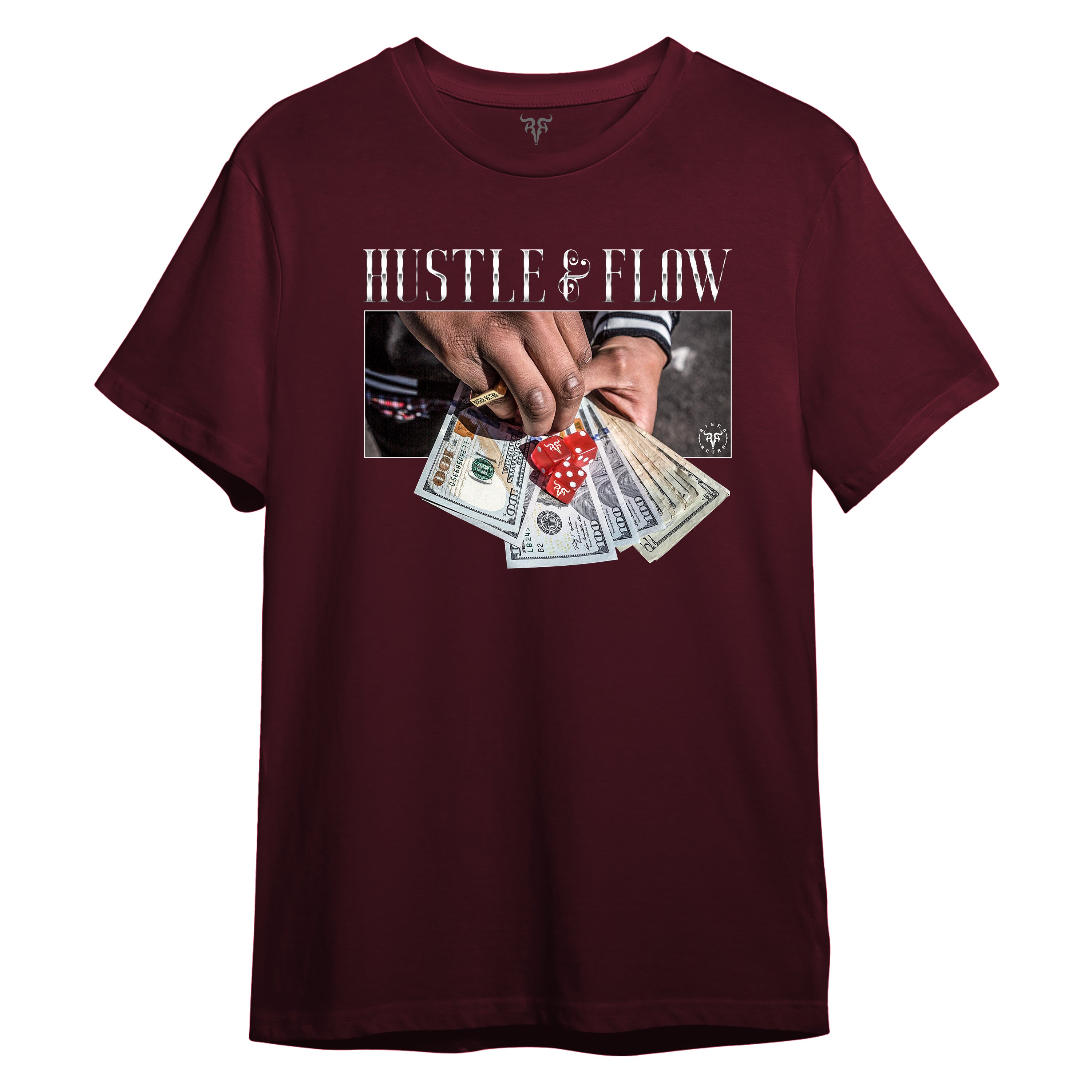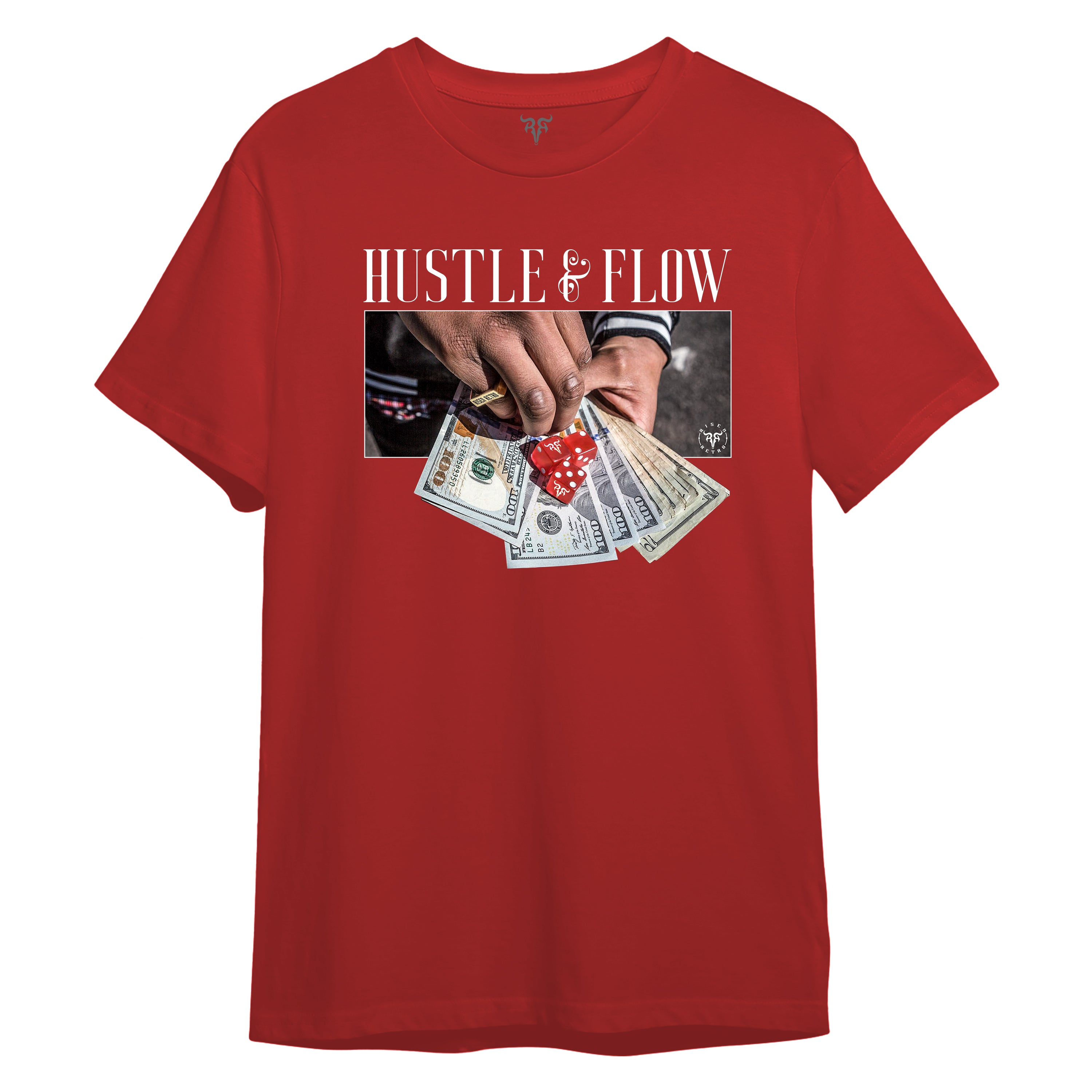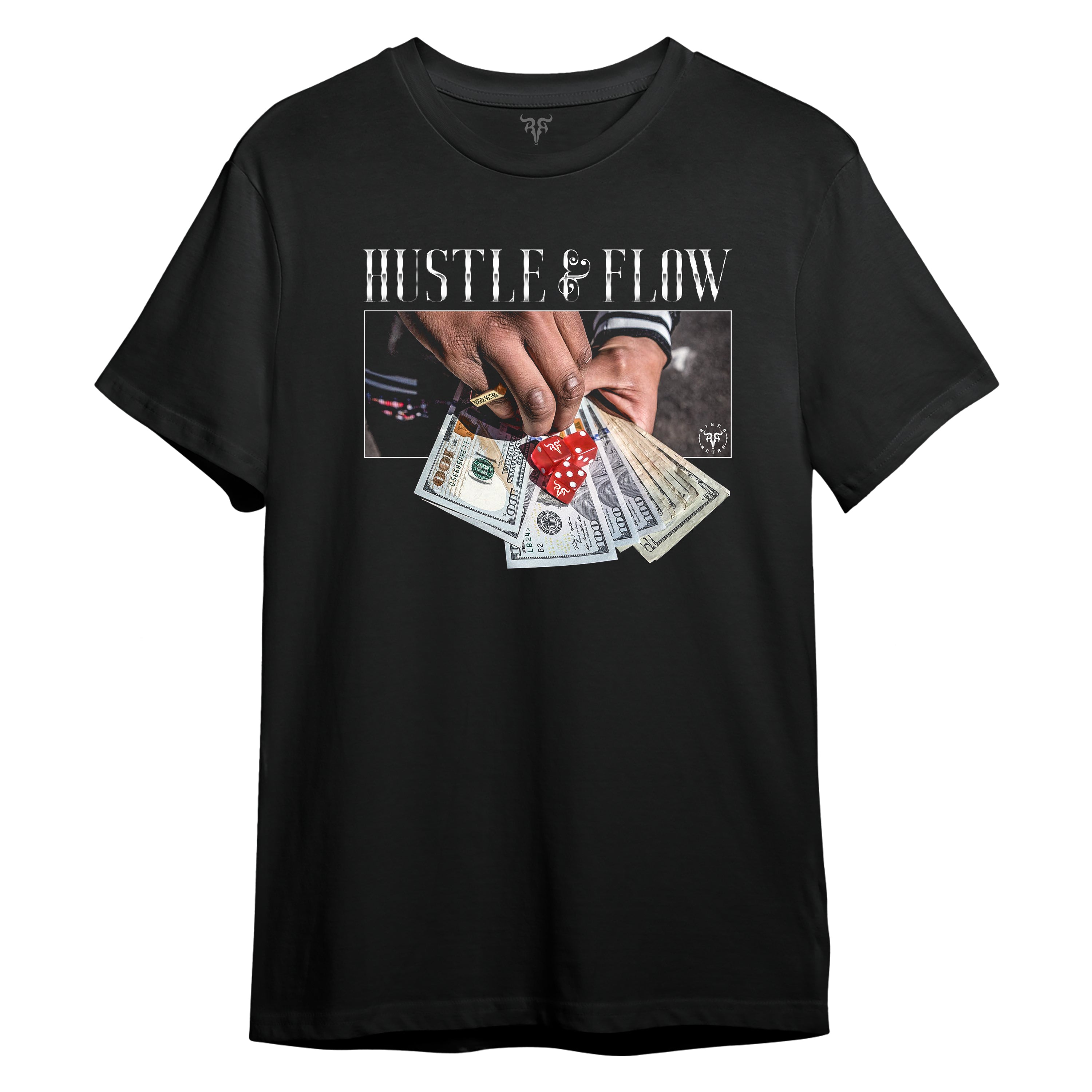 • Design: “HUSTLE & FLOW” DTG print with hands, cash, and dice graphic, RISENRETRO logo on sleeve